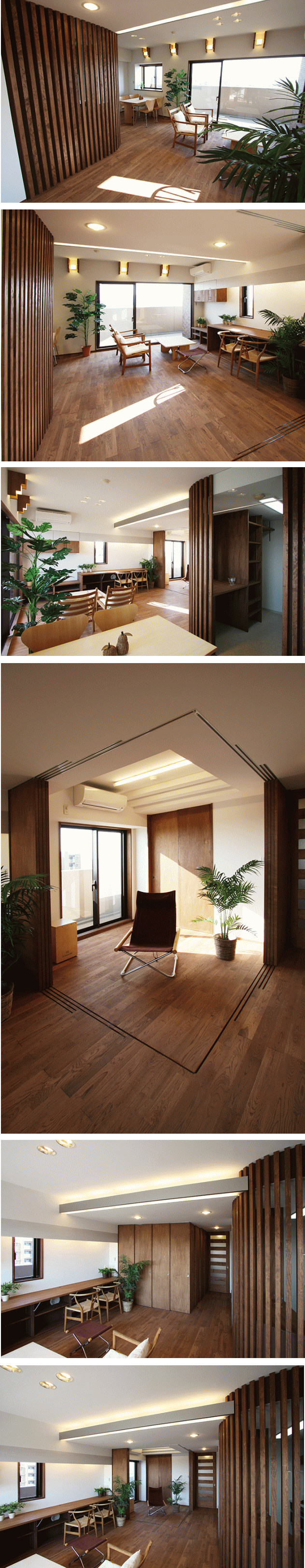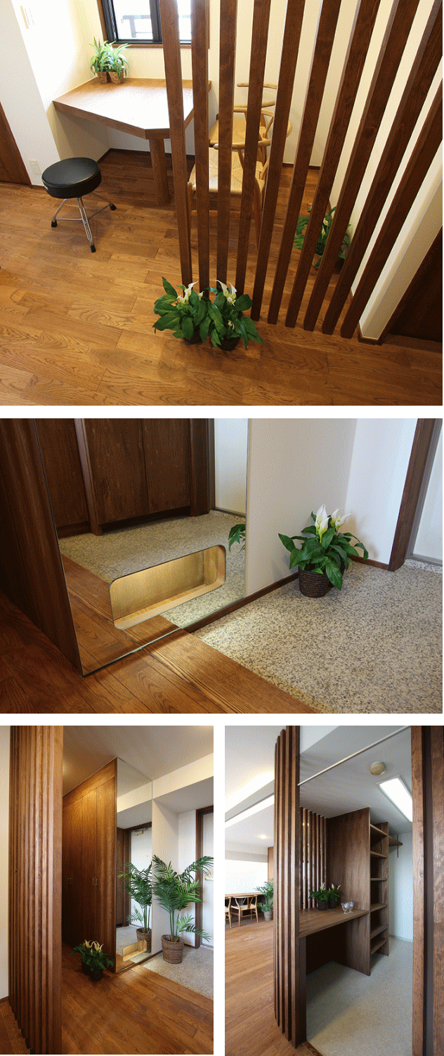 更に、要所々々に縦格子の間仕切を使って、空間どうしで気配を感じられるような、配慮をしました。