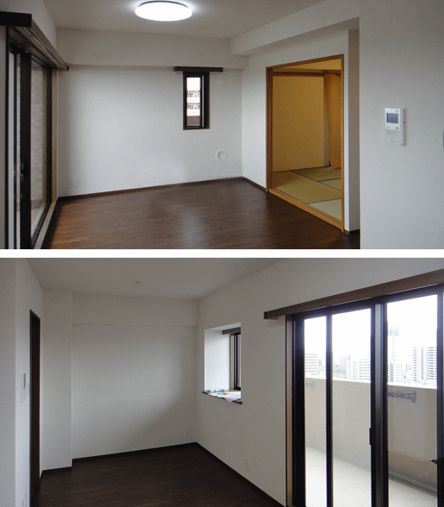 マンションと言えば、柱形や梁型が出っ張っていてそれらに囲まれた空間、そして、個室に区分けされた小さい空間の集まりです。その「マンションらしさ」をどう消すかがマンションリフォームの基本になると思います。