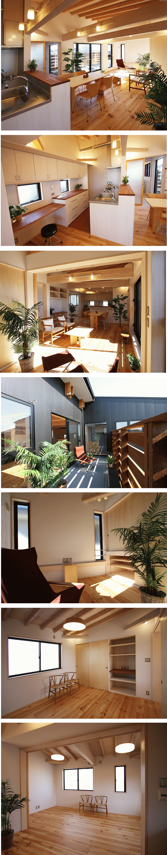 1階は、居間+食堂を中心に玄関、タタミの間、洗面脱衣室、寝室、 厨房が接していて、それぞれの引戸を開けると部屋全部が繋がる使いやす広々空間です。